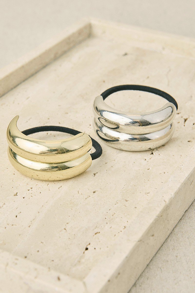 Gomas de pelo con aplique metálico dorado o plateado. Recoge el cabello con estilo y efecto joya.