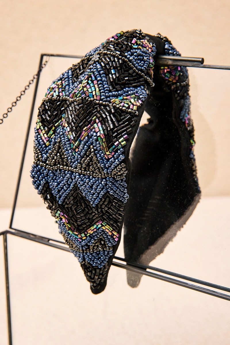 Diadema de tejido de algodón decorada con un bordado artesanal de piezas de resina aplicadas a mano. Su diseño en relieve y los reflejos de sus cuentas aportan textura y brillo, convirtiéndola en un accesorio distintivo y sofisticado para cualquier ocasión.