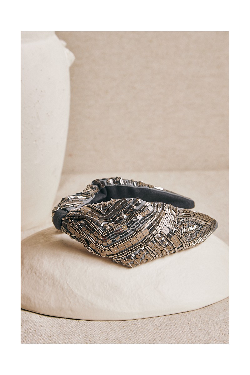 Diadema de algodón con bordado artesanal de cuentas y lentejuelas aplicadas a mano. Un diseño geométrico que combina brillo y textura para aportar un toque sofisticado y distintivo a cualquier look
