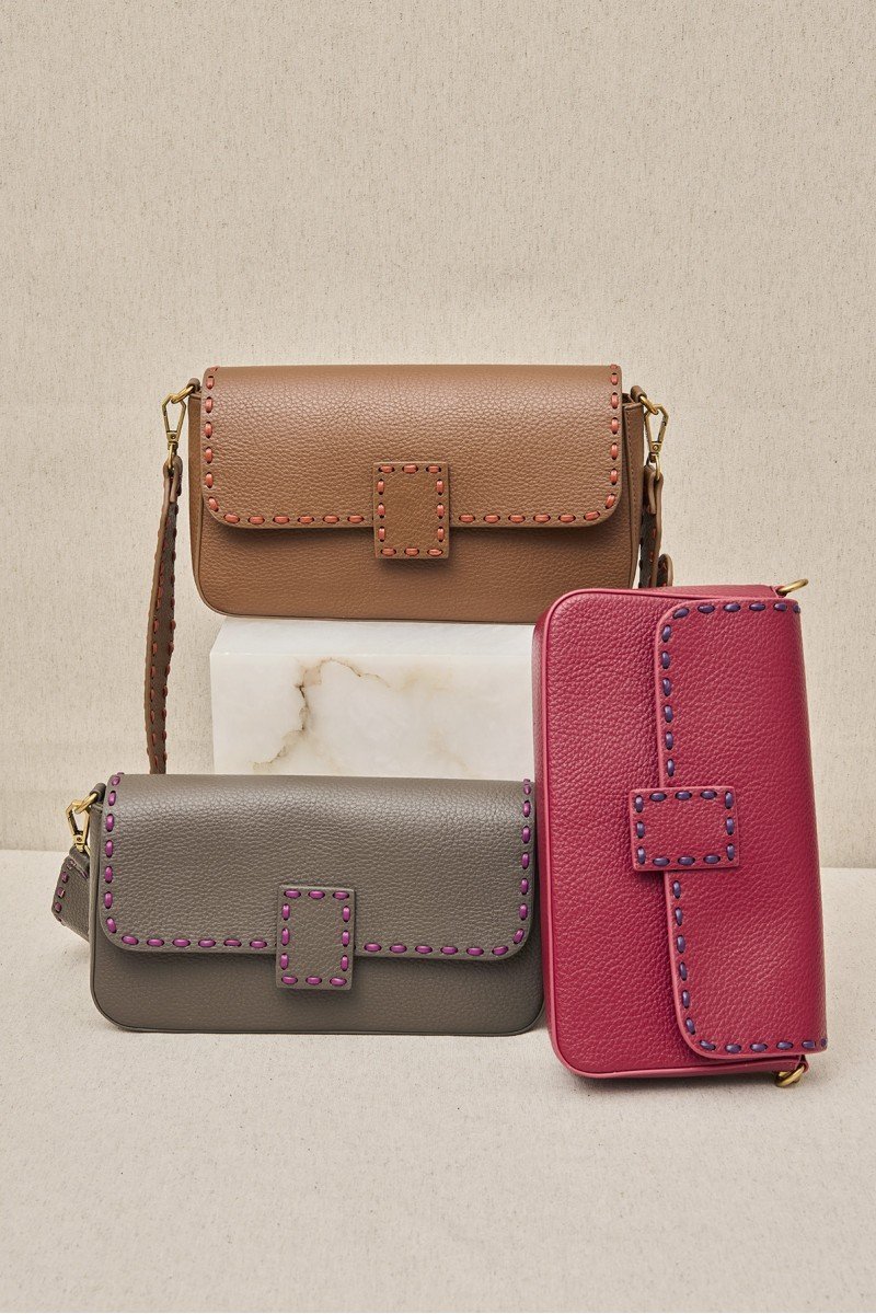Bolso urbano de formato alargado con textura granulada y detalle de costuras decorativas en contraste. Incluye bandolera extraíble con herrajes metálicos que combina funcionalidad y estilo.