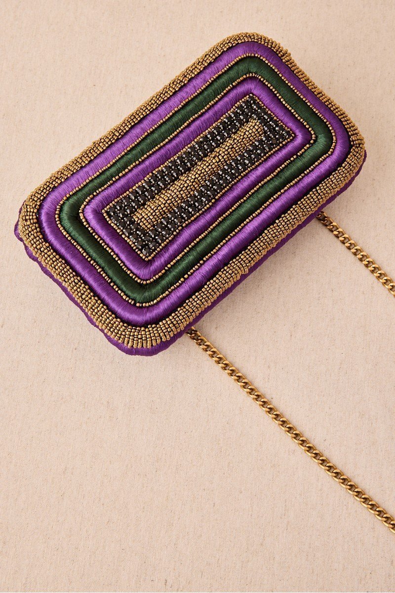 Espectacular Clutch joya todo bordado a mano en un diseño de geometrías, que lo convierten en una pieza única. Su estructura compacta y su acabado artesanal lo convierten en un complemento especial para eventos y celebraciones.