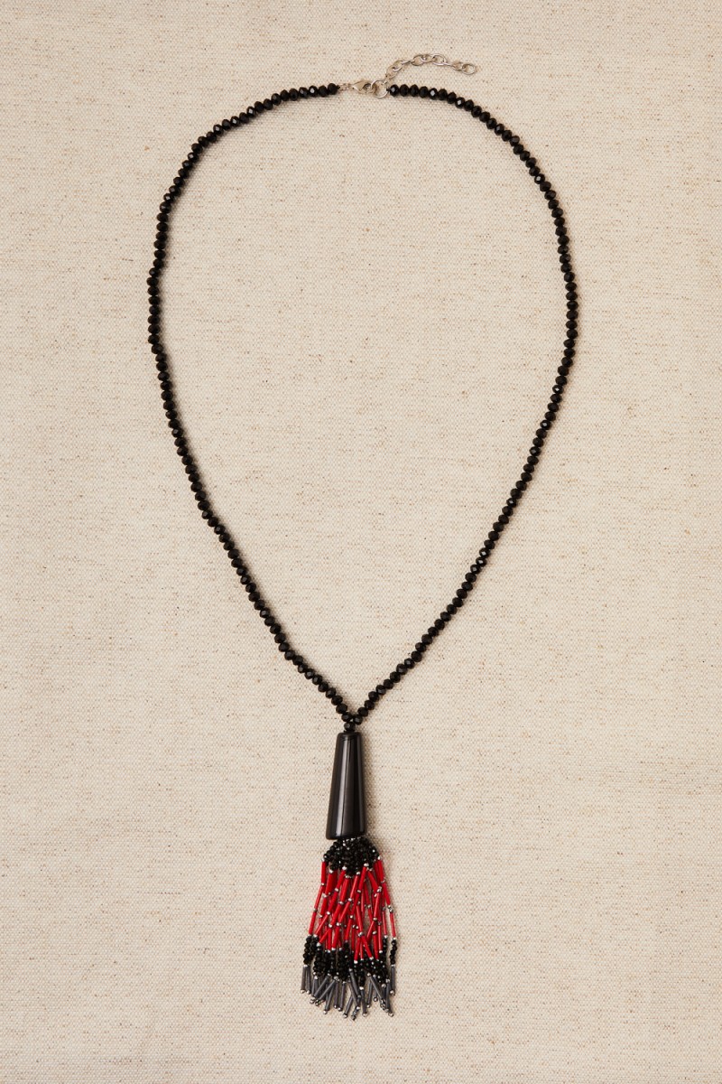 Un accesorio que expresa tu personalidad es este collar largo con borla de flecos en cristales de colores. Con un toque boho chic, es el complemento ideal para cualquier ocasión. Su diseño de flecos añade un toque único y sofisticado que realza cualquier look.