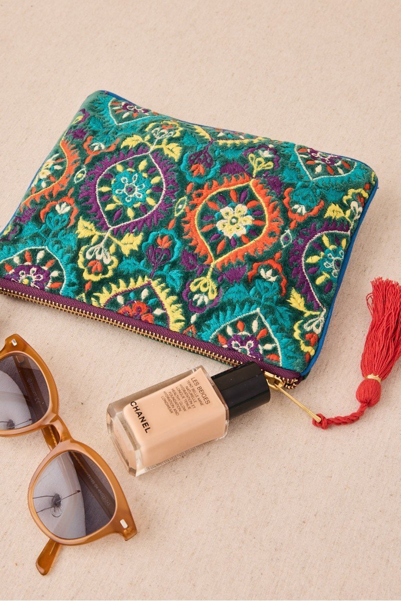 Bolsita mediana de terciopelo verde con bordado floral en colores intensos. Un accesorio llamativo para llevar maquillaje, gafas o pequeños esenciales en tu bolso de invierno.