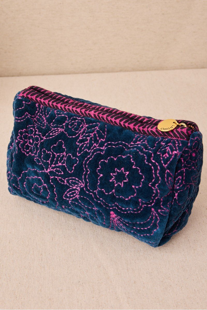 Bolsita mediana de terciopelo con print de rayas en tonos intensos y bordados con hilos que aportan textura y carácter. Perfecta para dar color a tus días de invierno y mantener el orden con estilo.