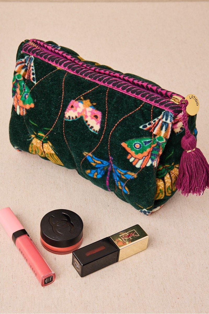 Compacta y con forma ligeramente redondeada, esta bolsita en terciopelo estampado destaca por su textura acolchada y los pespuntes en hilo que dibujan sutiles relieves. Un accesorio práctico y especial para acompañarte a diario.